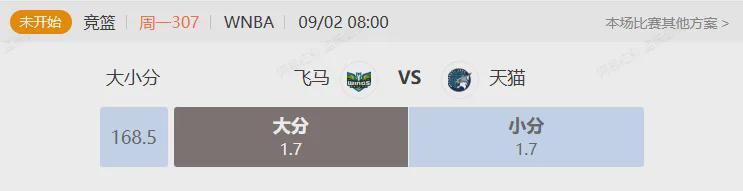 本场比赛,飞马的对手,是领头羊天猫,天猫上一场比赛兵不血刃地以24分大胜太阳,此番对阵飞马,球队在实力和战绩上均处于明显优势,且两队近三次交锋,天猫均取得较明显优势的胜利,本场看似优势明显,不过,本场偏大的让步分数,以及天猫如今榜首已定,求胜欲平平的现状,使得胜负存在了不小的变数。但在比分方面,本场比赛,飞马核心佩奇将确定继续出战,上一场她回归后状态不错,得到16分10助攻的两双,在她的带领下,前探花西格里斯特得到了不少的投篮良机,本场,球队本赛季发挥不错的新人詹姆斯状态升级为出战成疑,如果她回归,对于飞马的进攻是一大补充。而天猫一方阵容齐整,科利尔,麦克布莱德,考特尼威姆斯等核心均非常健康,火力点齐备,因此,在一方进攻有所补强,另一方火力正旺的情况下,大比分,或许是本场最合适的选择。