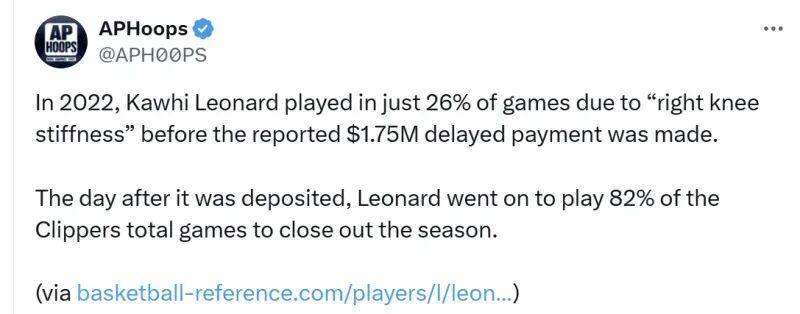 我再帮大家回忆下,伦纳德21-22赛季因为ACL赛季报销,22-23赛季复出,没打几场然后踩到科菲的脚崴脚又歇了几场,真的是作贼的遇见劫路的,赶巧了。